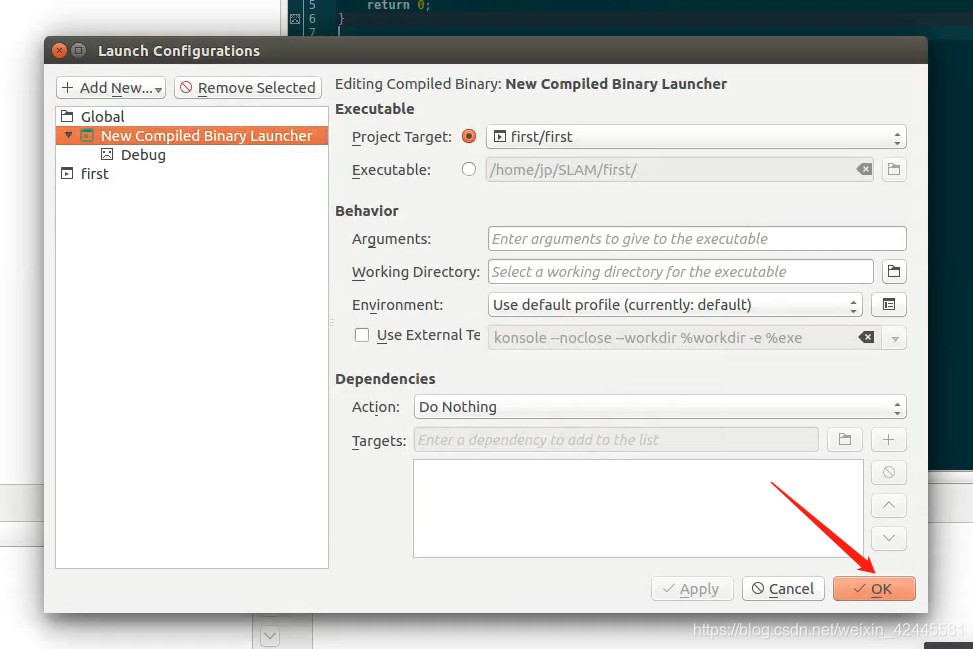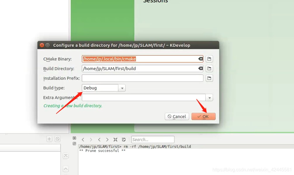 这里保持默认就可以了。值得注意的是,这里的build type保留debug,后面就可以直接调试了,而不需要像一些教学上讲的在cmakelists.txt添加 set( cmake_build_type "debug" ) 。