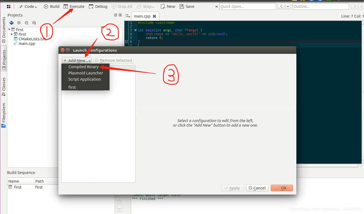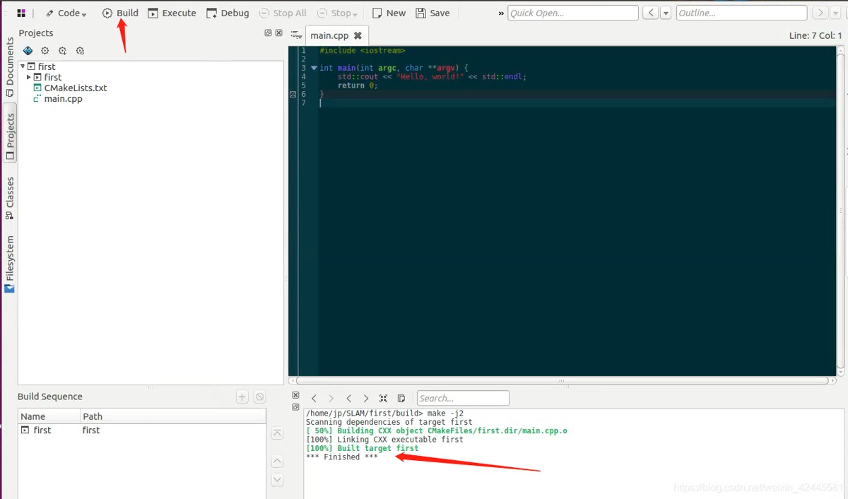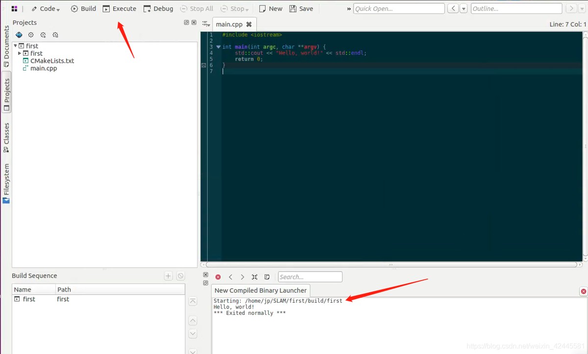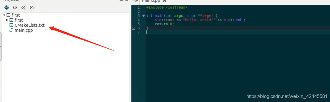 展开工程可以看到,软件已经自动为我们创建好了cmakelists.txt和主函数main.cpp。