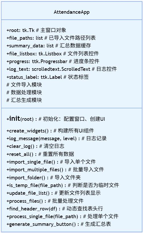 采用面向对象(oop) 设计,将功能封装为attendanceapp类,核心优势是 “数据与逻辑封装、代码复用、便于维护”。类的核心结构如下:
