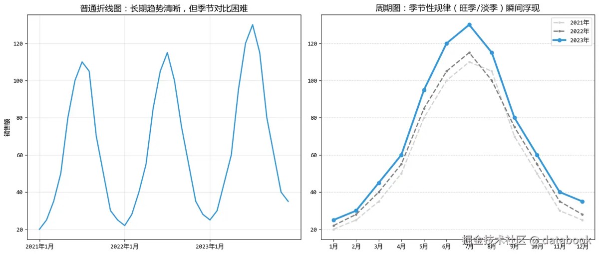 # 周期图 months = ['1月', '2月', '3月', '4月', '5月', '6月', '7月', '8月', '9月', '10月', '11月', '12月'] # 模拟长数据 sales_2021 = [20, 25, 35, 50, 80, 100, 110, 105, 70, 50, 30, 25] sales_2022 = [22, 28, 40, 55, 85, 105, 115, 100, 75, 55, 35, 28] sales_2023 = [25, 30, 45, 60, 95, 120, 130, 115, 80, 60, 40, 35] fig, (ax1, ax2) = plt.subplots(1, 2, figsize=(14, 6)) # --- 左图:普通折线图 (线性时间轴) --- # 把所有数据拼成一条长线 all_sales = sales_2021 + sales_2022 + sales_2023 all_months_idx = range(len(all_sales)) ax1.plot(all_months_idx, all_sales, color='#3498db', linewidth=2) # 省略 ... # --- 右图:周期图 (叠加时间轴) --- ax2.plot(months, sales_2021, marker='.', label='2021年', color='lightgrey', linewidth=2, linestyle='--') ax2.plot(months, sales_2022, marker='.', label='2022年', color='grey', linewidth=2, linestyle='--') ax2.plot(months, sales_2023, marker='o', label='2023年', color='#3498db', linewidth=3) # 省略 ... plt.tight_layout() plt.show()
