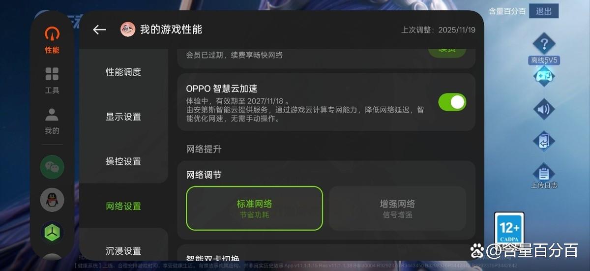 游戏相关的硬件层面,一加15的优势加入了自研电竞网络芯片g2以及灵犀触控芯,通过硬件层面升级来进一步提升联网性能以及触控灵敏度,延续了免费赠送1年oppo智慧云加速服务,同时加入了功耗更低的标准网络选项和信号强度更高的增强网络供用户选择,功能更加实用。