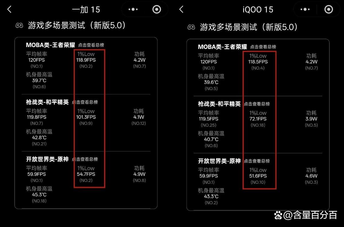 当然直接拿165帧对比144帧没有太大的说服力,我这里直接用小白测评在同一刷新率下的手游测试结果进行对比点评。跟pc游戏一样,手游的平均帧率已经不再能展现游戏画面的流畅度,同样引入了1% low帧,后续可能还会引进0.1% low帧。这个1% low帧是指在一定游戏时间内,帧率处于最低1%区间内的平均值,数值代表着游戏的下限帧率,是判断游戏是否卡顿的关键指标。如果1% low帧越接近 平均帧率,就说明游戏画面越流畅,对应的cpu、gpu、ram等硬件性能也就越出色。一加15和iqoo 15在《王者荣耀》《原神》下的1% low帧差异不大,一加15只是略微胜出,但在《和平精英》这款游戏中明显高于iqoo 15,一加15的1% low帧是iqoo 15的1.4倍,数据相差了近30帧,这就意味着一加15在游戏画面流畅度方面要远高于iqoo 15,这对于《和平精英》玩家来说是会是个极大的吸引点。