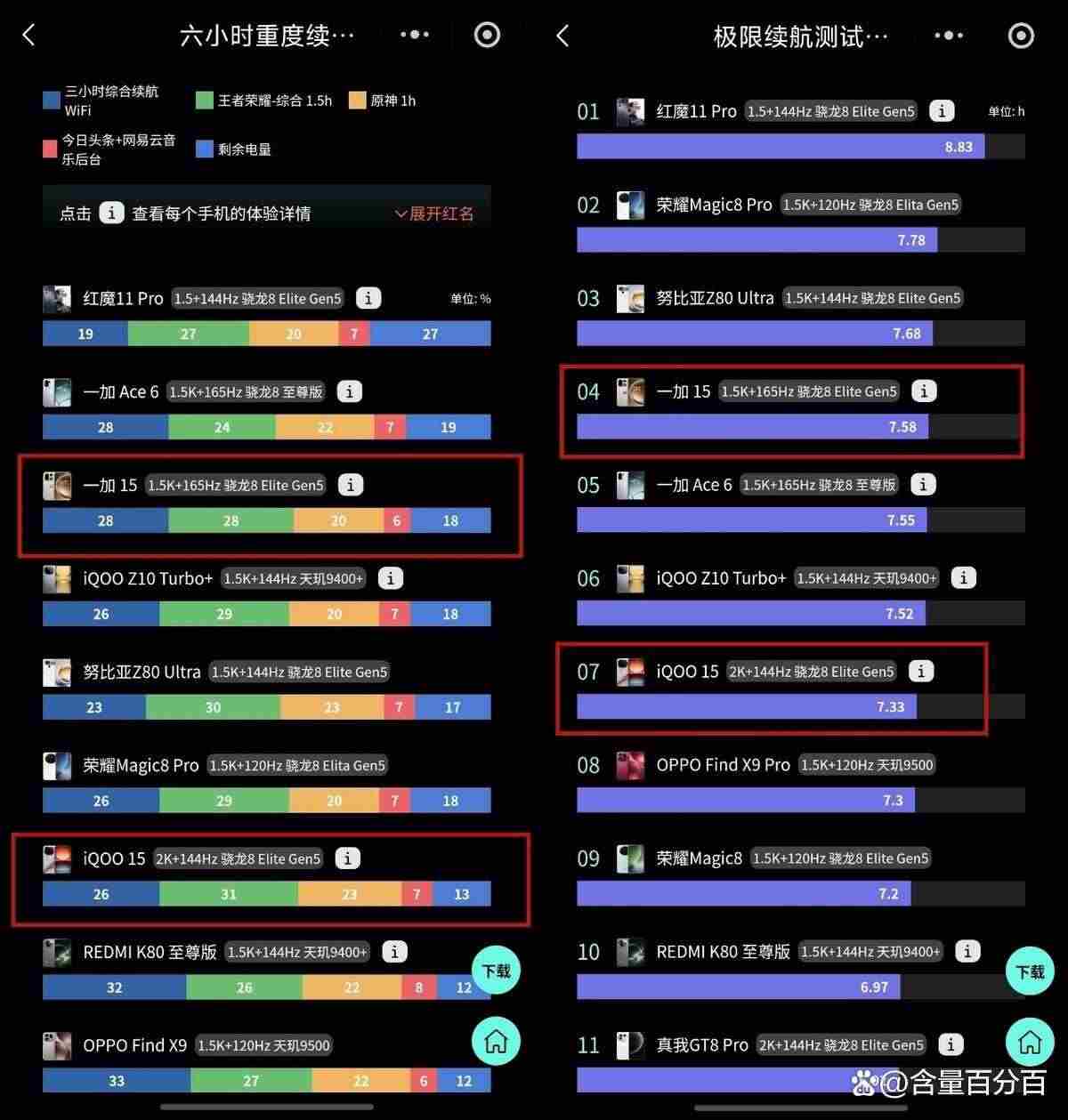 这个部分可以参考网络已有的数据,iqoo 15的7000mah电池搭配原装100w充电器充满电时间大约是51分钟,而一加15的7300mah电池搭配原装120w充电器充满电时间大约是39分钟。实际续航测试参考小白测评的数据,一加15无论是六小时重度续航测试还是极限续航测试,结果都要比iqoo 15高一些。如果你追求更大容量电池、更高性能的快充、更长的续航性能,那就考虑一加15。