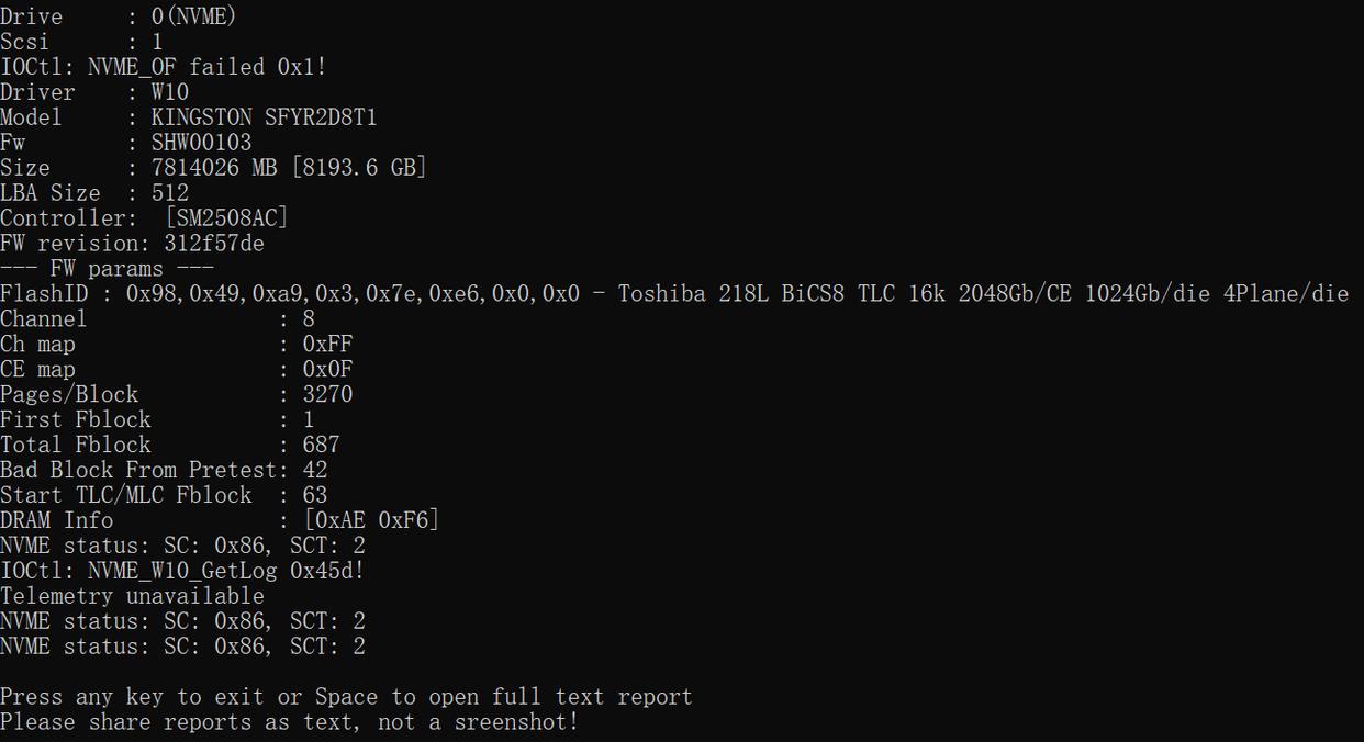 金士顿fury renegade g5 8tb采用的nand颗粒由金士顿自封而来,我手中的这款料号为fs02t08uct1。