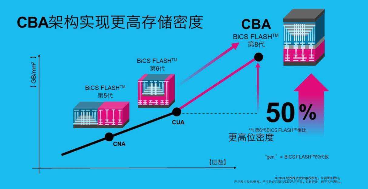 铠侠bics 8是目前世界上性能最强的tlc nand颗粒之一,采用了218l堆叠,虽然堆叠层数不算高,但是凭借类似xtacking的cpa(cmos直接键合存储单元阵列)架构,接口速度最高可以达到3600 mt/s,存储密度更是达到了18.3gb/mm²。