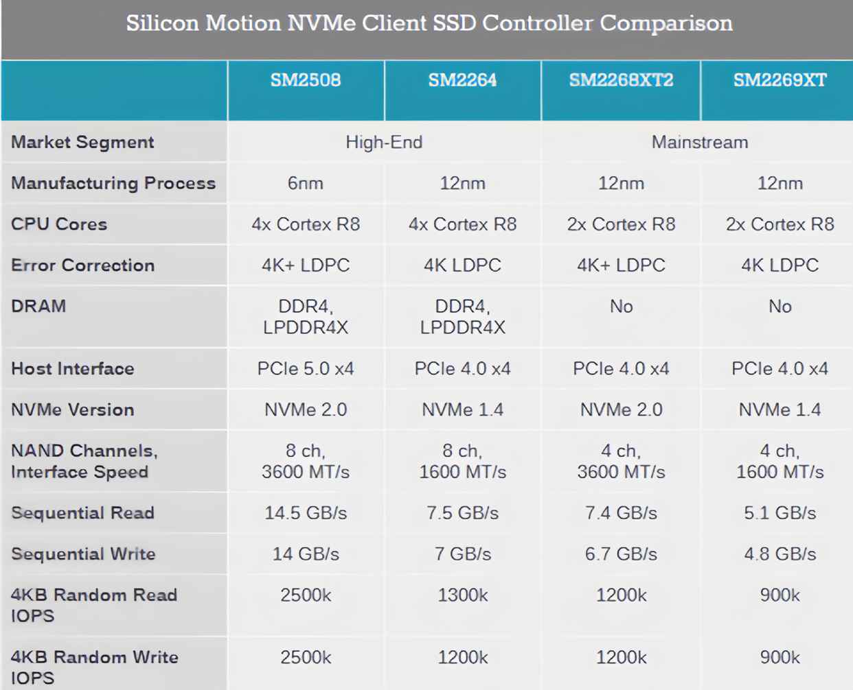 作为一款8通道ssd主控,慧荣sm2508最高支持3600 mt/s的nand接口速率,集成了4个arm cortex-r8高性能核心和1个cortex-m0低功耗核心,是许多pcie 5.0旗舰ssd的共同选择。