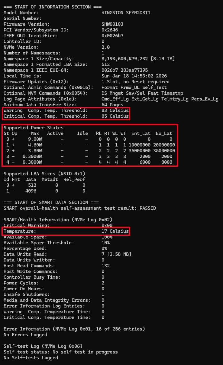 同时在s.m.a.r.t信息中我们还可以看到,金士顿fury renegade g5 8tb与4tb版本一样,本身只提供了1个温度传感器,并且温度墙比较保守,分别为83℃和85℃。