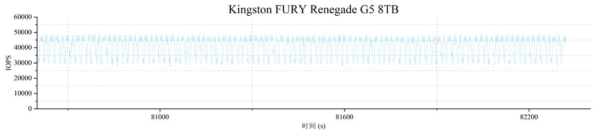 从下图中可以看到,在82000多秒的测试过程中,金士顿fury renegade g5 8tb的4k随机写入曲线大致呈现了fob——transition——steady state三个阶段的经典特征,考虑到它巨大的容量给主控带来的管理压力,这个表现已经足以称得上不错。