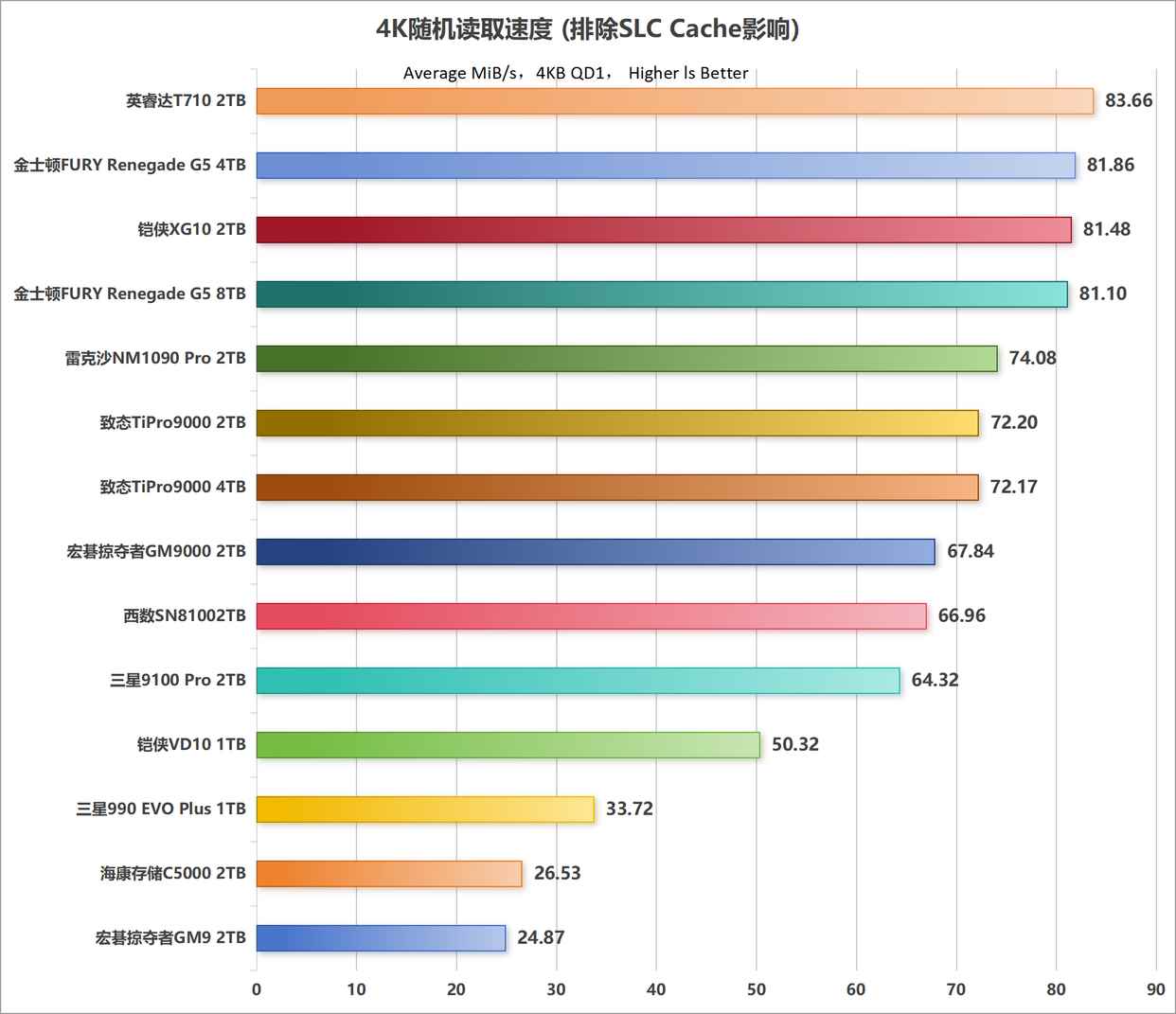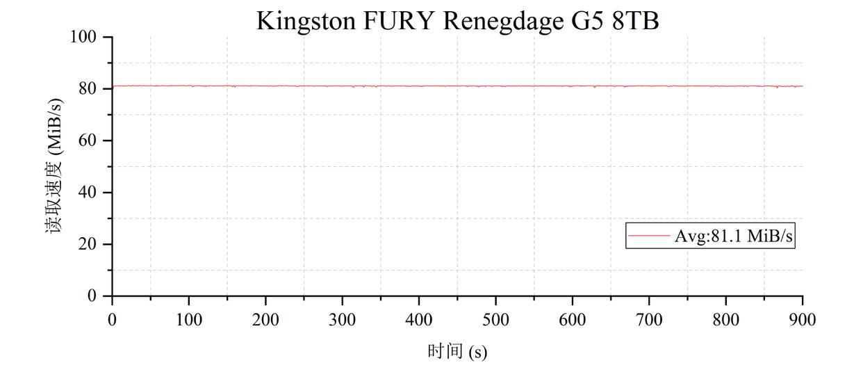 从上图中可以看到,金士顿fury renegade g5 4tb的4k随机缓外读取速度在81.1 mib/s左右,仅仅略低于4tb版本不到1 mib/s,是目前我所知消费级闪存ssd中的顶级水准。