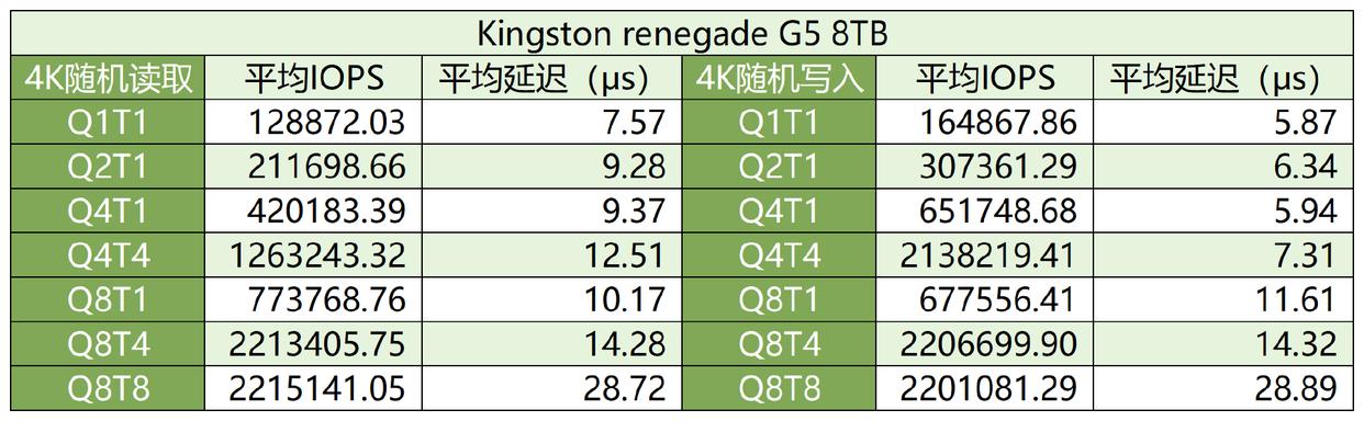 与其他消费级pcie 5.0 ssd的测试结果对比,可以看得出金士顿fury renegade g5 8tb对于低队列的随机纯读、纯写优化较好,调校方向明显是贴合消费级用户的实际使用场景: