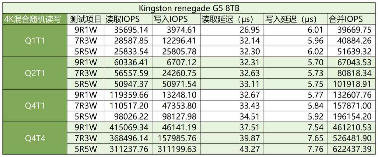 这次金士顿fury renegade g5 8tb倒是在各组合下都排名领先,混合性能调校得相当不错,firmware部门立功了: