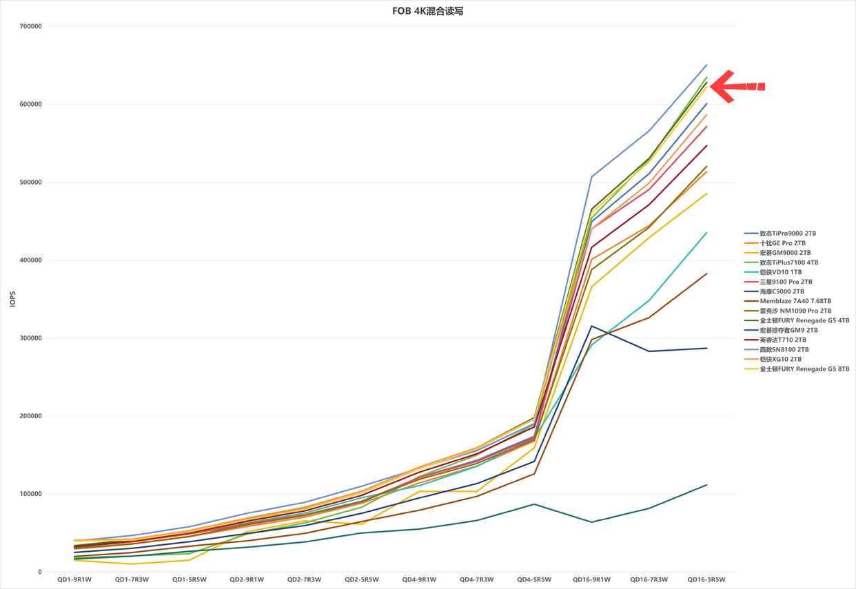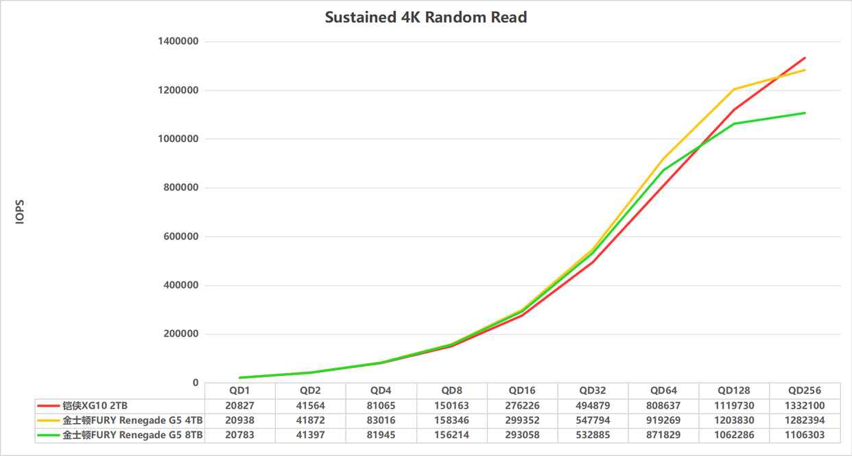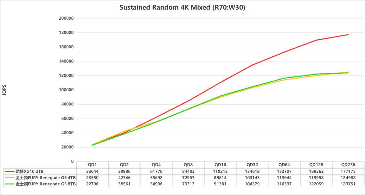 在qd1-qd256不同队列深度下,金士顿fury renegade g5 8tb与4tb版本几乎有着一致的性能表现,这倒是让人挺高兴,没有因为容量翻倍就有明显的性能下降。