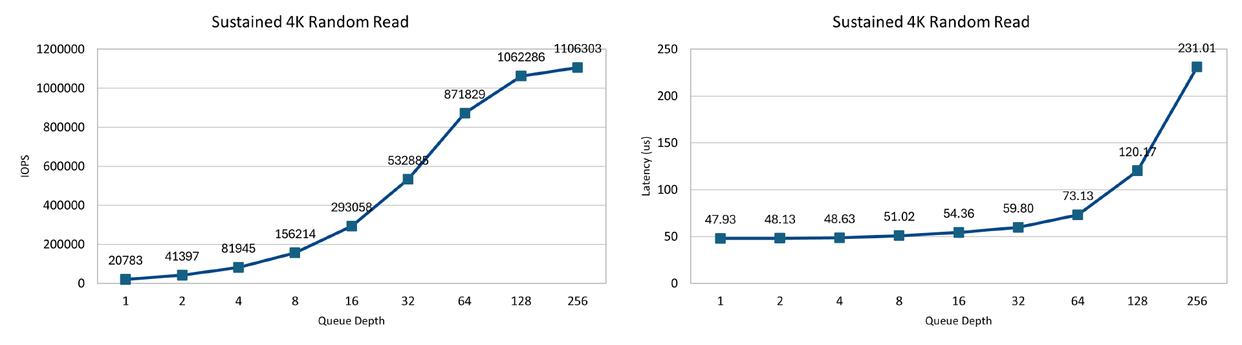 在不同队列深度下的4k稳态随机读取性能如下图所示: