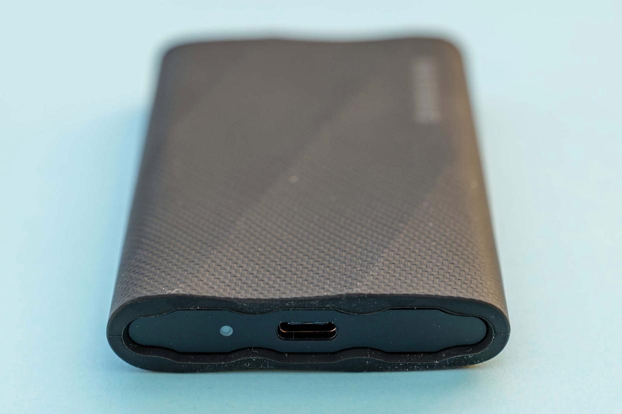 三星t9表面包裹着一层类似软橡胶的保护套,防滑减震效果相当优秀,在体积方面比致态灵·潮流版略大了一点儿,尺寸为88mm x 60mm x 14mm,而且没有磁吸功能,更符合传统印象中的pssd的样子: