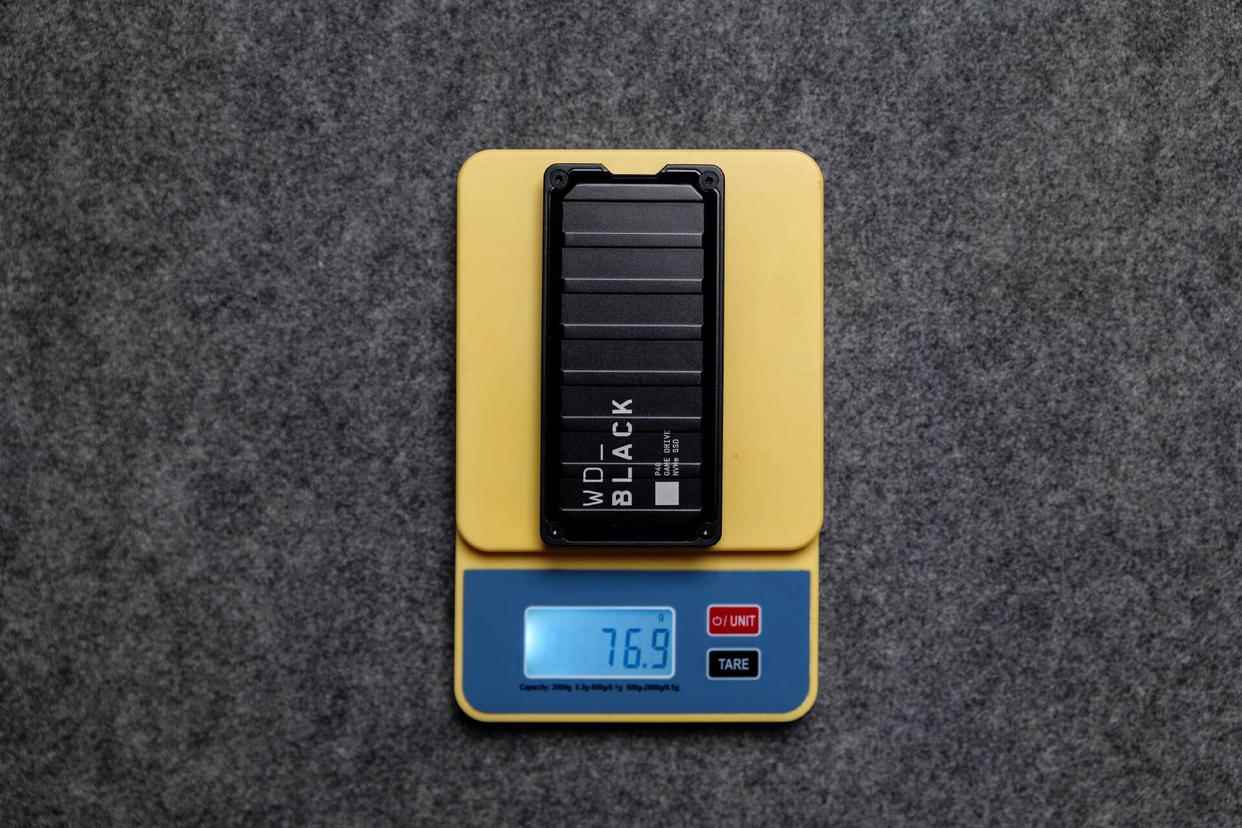 实测西数p40的重量大约为76.9g,竟然比体积更小的三星t9更轻,这一点倒是做得不错:
