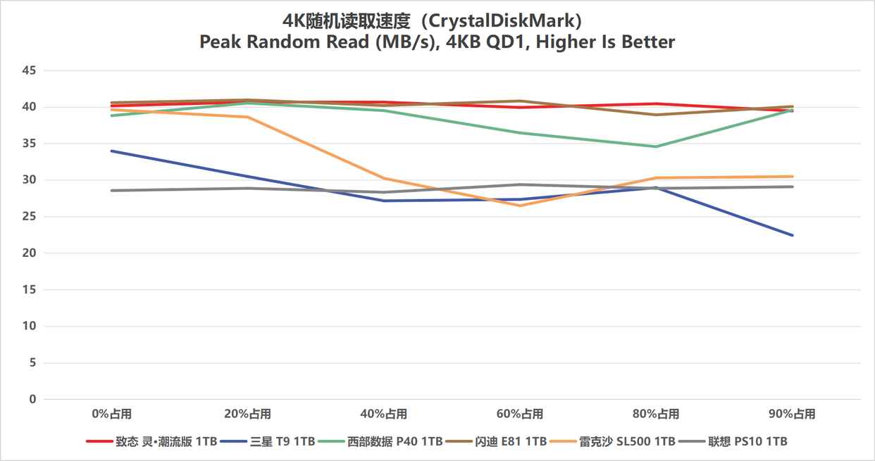 而同为原厂出品的三星t9,其表现有些出人意料,随着占用率的提高,各测试项目的成绩都有相对明显的下滑。尽管在这种不够严谨的测试中,缓存策略或者主控机制都有可能引起它的性能下滑,但从结果上看,确实是有点不尽人意。