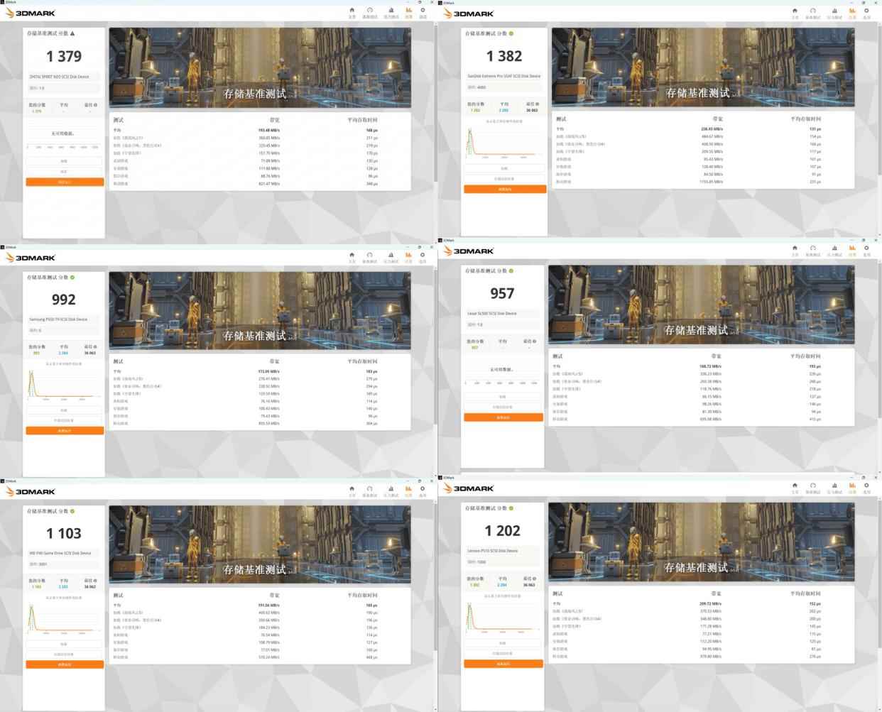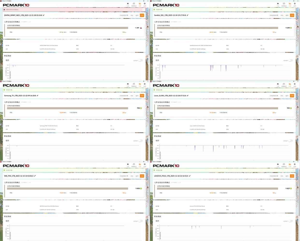 接着我们使用pcmark10的完整系统盘基准测试功能,来测试6款pssd的综合性能。