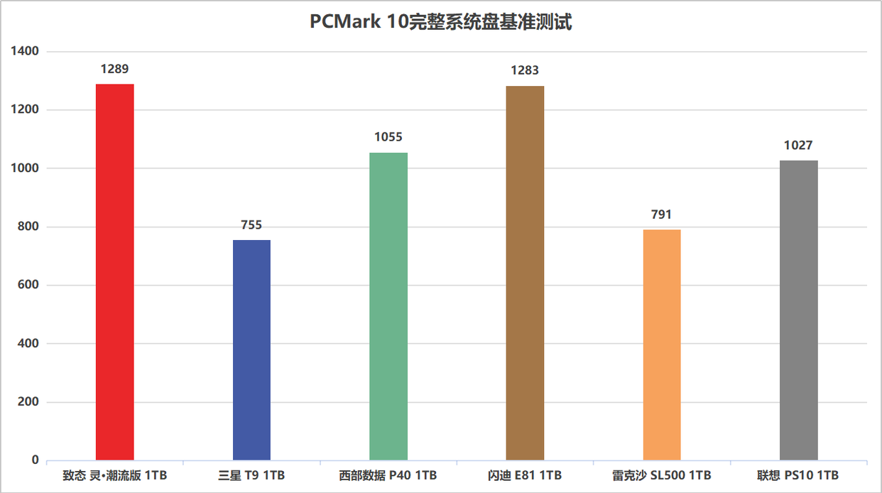 在该项测试中,致态灵·潮流版得分最高,达到了1289分,和1283分的闪迪e81非常接近;接下来西数p40和联想ps10的得分则在1000左右;而三星t9和雷克沙sl500的成绩就相对低一些,不到800分。