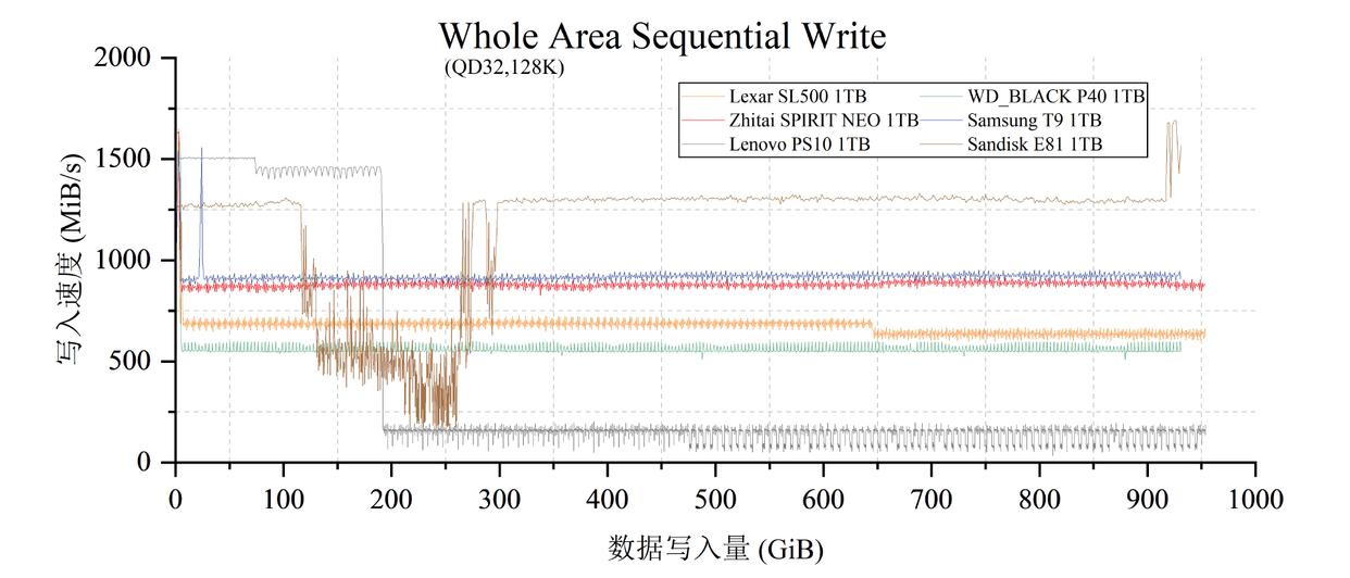 对于pssd来说,写入曲线在出缓后的平稳程度,对用户的实际影响是显著的,特别是针对大容量、持续写入状态下等场景(素材拷贝,内容创作等),稳定的写入速度会带来更高的效率。所以下面咱们来挨个具体分析一下6款pssd的全盘写入曲线: