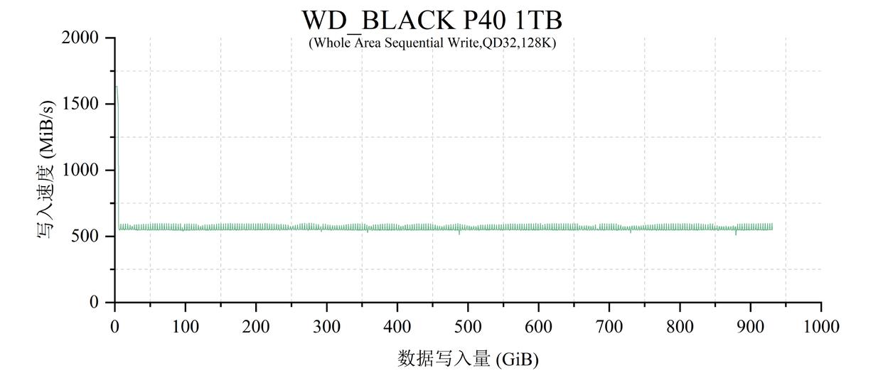 西数p40的写入曲线就挺奇怪,虽然里面直接插了sn650e这款m.2 2280 ssd,但在出缓后的写入速度只能保持在平均556.9 mib/s左右,慢到让人费解。