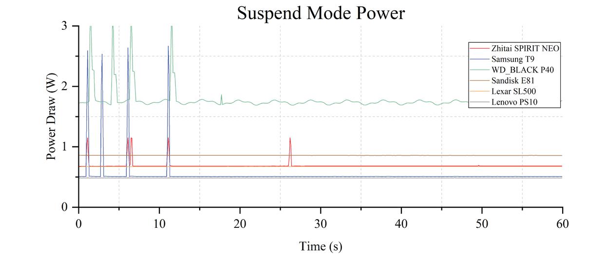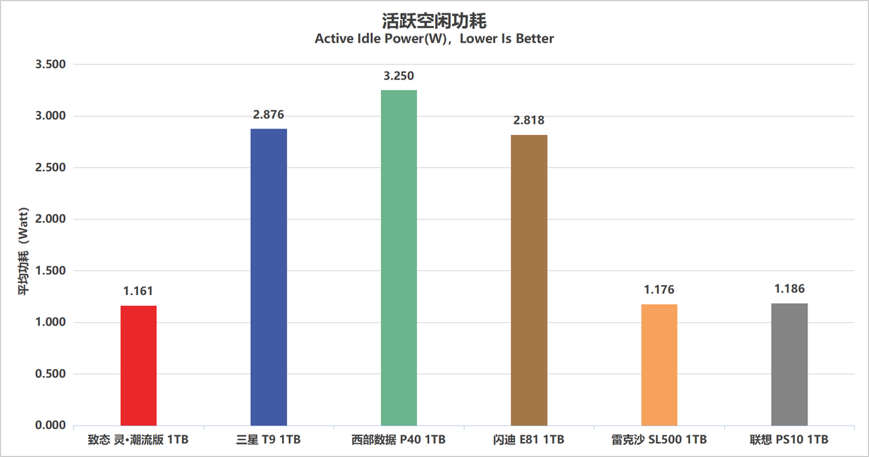 可以看到,西数p40的待机功耗达到了惊人的1.769w,而其他5款产品在待机时都只有不到1w的功耗: