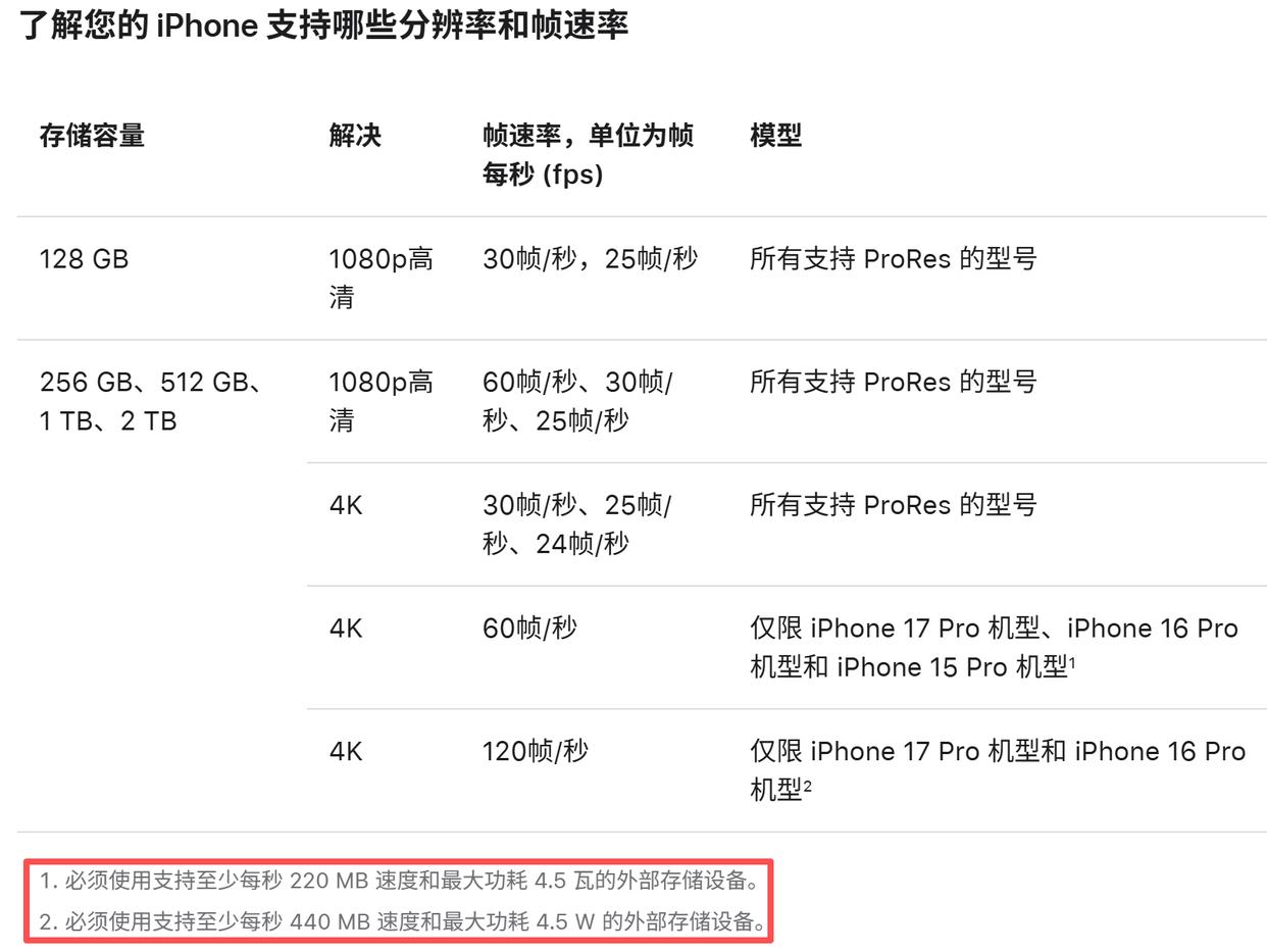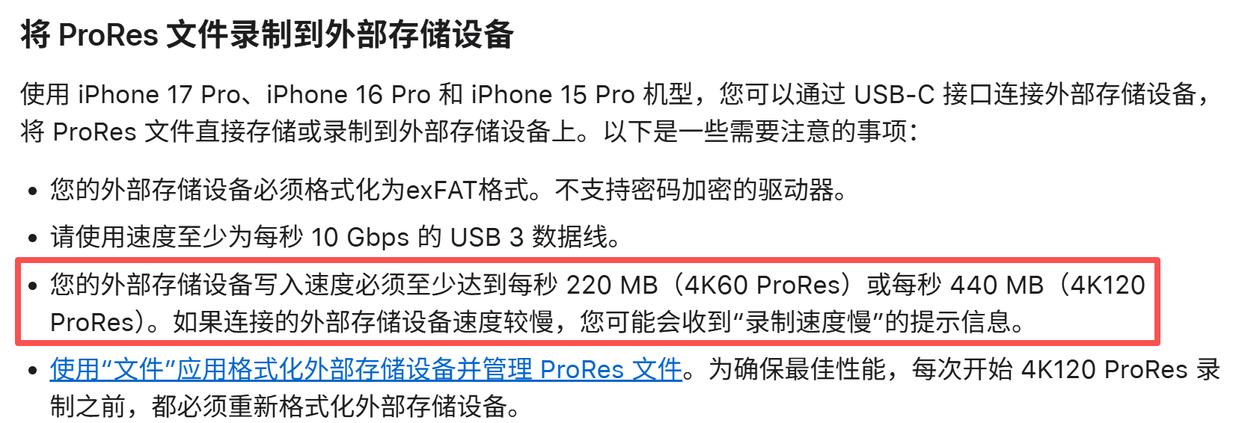 只不过iphone外录apple prores的功能对于pssd的性能有一定要求,根据苹果官网的信息,外录4k 60hz prores视频需要确保220mb/s的最低写入速度,外录4k 120hz prores视频则需要确保440mb/s的最低写入速度。