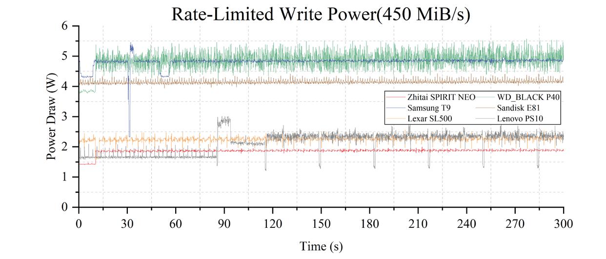 为了模拟外录4k 120hz prores视频的工况,我使用fio对6款pssd进行了时长为300s的顺序写入测试,并将速度上限控制在450 mib/s,记录下这个过程中各选手的实时功耗。