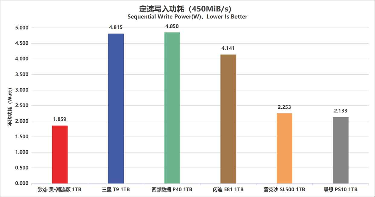 而致态、雷克沙和联想的写入功耗明显低得多,可以说优势一目了然。