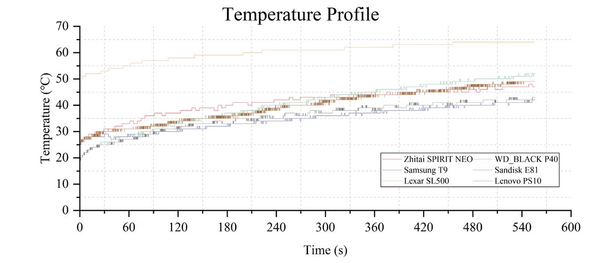 为了量化观察6款pssd在高负载写入工况下的温度,这里我在室温12℃的房间里,通过fio使用qd32 128k的参数,对这些产品进行了满负载顺序写入10分钟的测试,并在过程中记录下它们内部温度传感器的读数,整理出如下图表,方便大家对比: