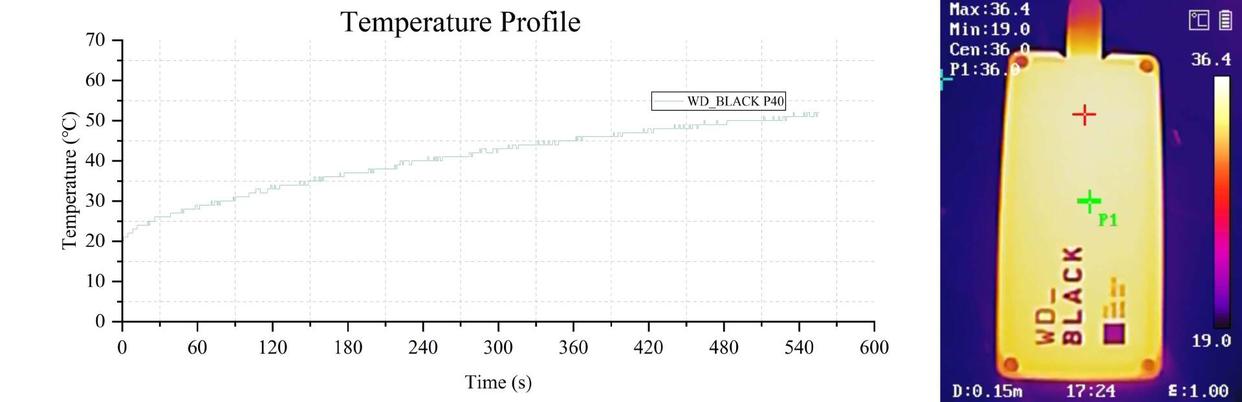(2)西数p40,在测试过程中传感器温度最高为52℃,金属外壳导热均热效果比较明显,从热成像仪照片中可以看到外壳的最高温度为36.4℃,中心点位也有36℃,这个温度不算烫,用手握住能感觉到整体都是温温的,不过不知道在30℃以上的夏天使用会是啥表现。