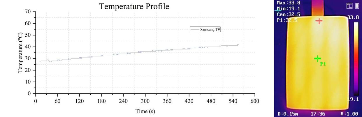 (3)三星t9,测试过程中传感器温度最高为42℃,由于外壳覆盖了一层橡胶保护套,所以表面温度最高处只有33.8℃,同样出现在靠近接口的位置,而外壳中心位置的温度为32.5℃,整体表现不错。