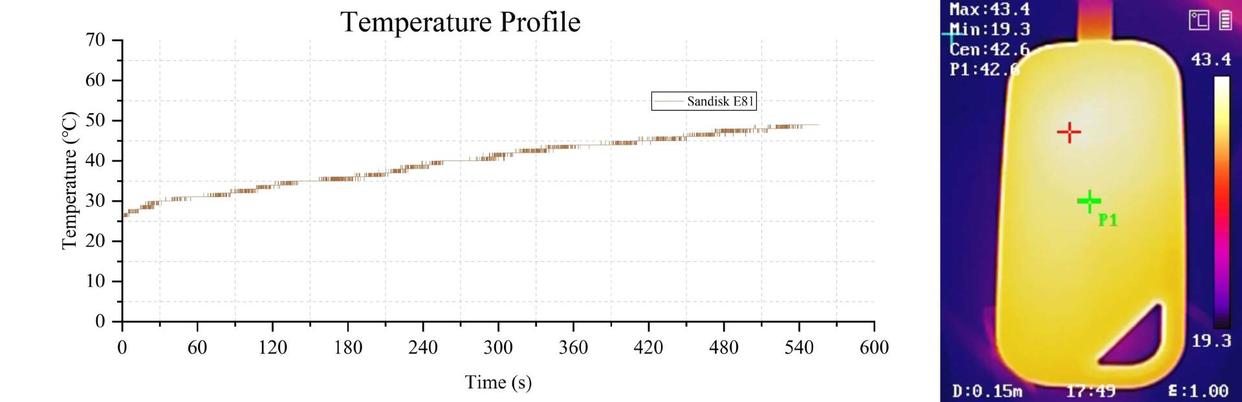 (4)闪迪e81的传感器最高温度为49℃,我查看了它的外壳两面,发现覆盖有橡胶层的一侧更热,外壳最高温度为43.4℃,外壳中心点位温度为42.6℃,金属打底的外壳在均热这方面的效果和西数p40差不多,握起来也是整体都温热而已,不烫手。