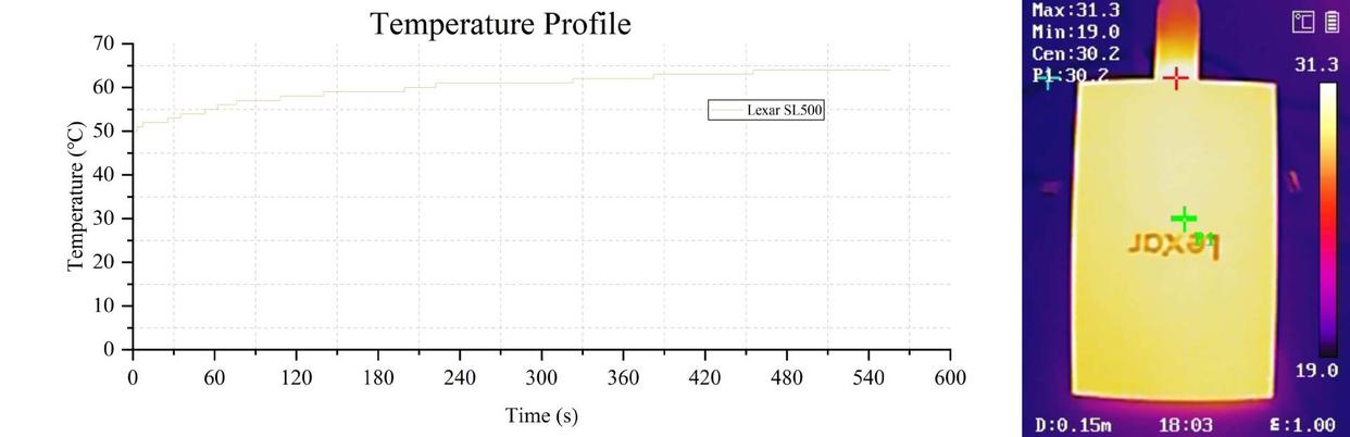 (1)致态灵·潮流版,在10分钟写入过程中传感器最高温度47℃,热成像仪照片显示,外壳中心点温度在31.8℃左右,靠近接口的区域温度最高,也只有35.7℃,用手握住也能感觉到外壳其实没啥发热,就是接口那里有点温温的而已,感觉磁吸到手机上来用确实合适,外壳温度不高,用久了也不至于烫手。