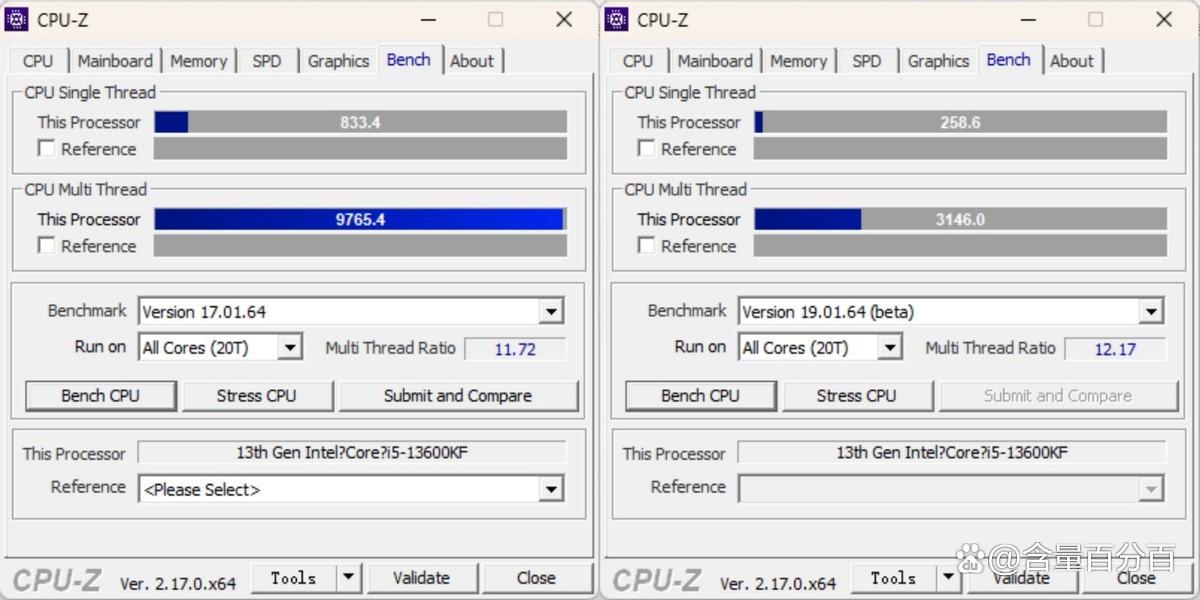 酷睿i5-13600kf默认设置在cpu-z(v17.01.64)下单线程性能得分为833.4,多线程性能得分为9765.4;在cpu-z(v19.01.64/beta)下单线程性能得分为258.6,多线程性能得分为3146。