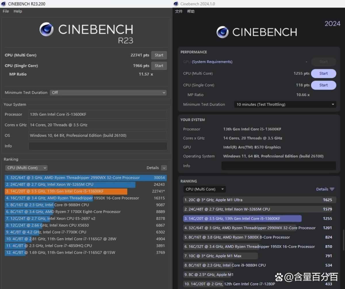 酷睿i5-13600kf在cinebench r23下的基准测试结果如下,默认参数下的多核测试结果为22741pts,单核测试结果为1966 pts;在cinebench 2024下的基准测试结果如下,默认参数下的多核测试结果为1255 pts,单核测试结果为118 pts。