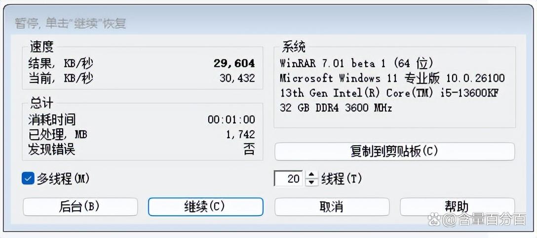 搭配winrar基准测试的时长选择了1分钟,对应的测试结果为29604 kb/s。