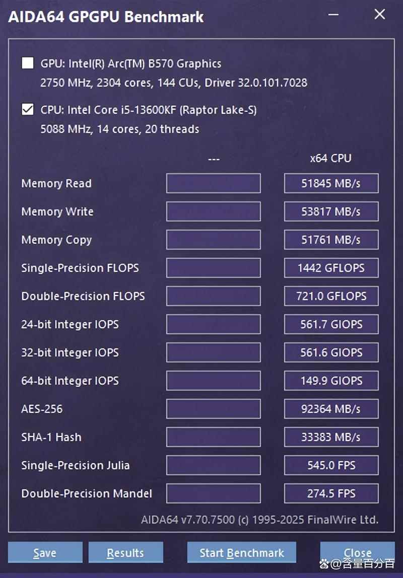 酷睿i5-13600kf搭配aida64 gpgpu测试时,cpu在 single-precision julia和double-precision mandel测试下对应的数据分别为545 fps和274.5 fps。