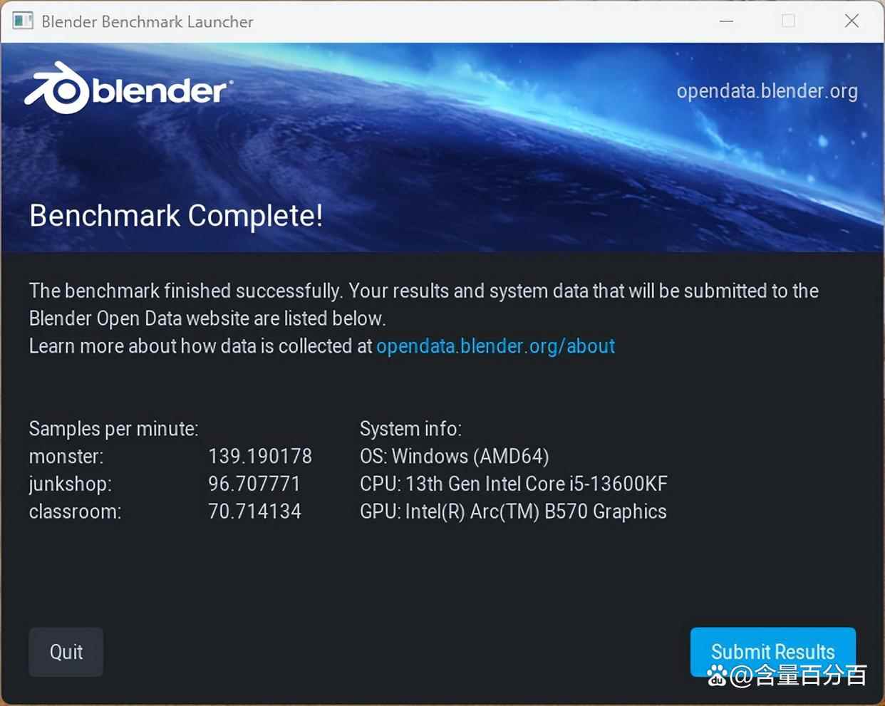 主机在blender benchmark下的测试结果如下,monster对应的数据为139.190178,junkshop对应的数据为96.707771,classroom对应的数据为70.714134。