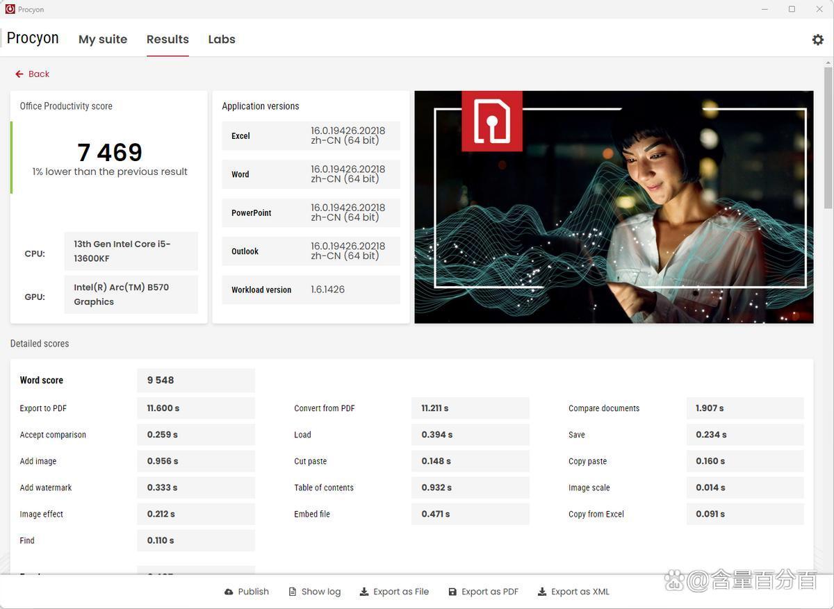 主机在 procyon办公生产力下的得分为7469,其中word得分9548,excel 得分6467,powerpoint 得分8790,outlook得分4405。