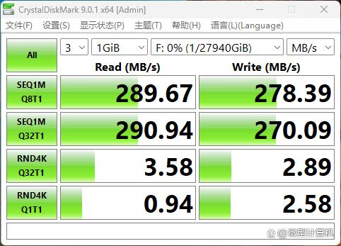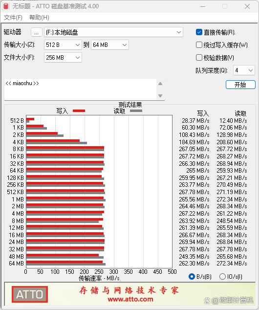 首先来看看希捷酷狼pro 30tb在crystaldiskmark 9.0.1和atto disk benchmark这两款主流存储设备基准性能测试软件中的表现。其中crystaldiskmark 9.0.1默认1gb测试,不论是q8t1还是q32t1,希捷酷狼pro 30tb的连续读取速度都稳定在290mb/s附近,皆超过其标称的最高传输速度275mb/s不少。在连续写入速度上,两个子项的成绩也分别达到278.39mb/s和270.09mb/s。