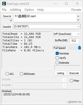 我们还搭配高性能固态硬盘测试了希捷酷狼pro 30tb硬盘在实际文件传输中的性能表现。固态硬盘选择容量2tb的三星990 evo plus,兼容pcie 4.0 x4和pcie 5.0 x2接口,能确保充分发挥酷狼pro 30tb硬盘的实力。在向固态硬盘传输容量高达22.1gb的单个视频文件,体现连续读写性能的应用中,希捷酷狼pro 30tb硬盘的读写速度分别为282.9mb/s、277.4mb/s,实际读写成绩同样超过标称最大值。
