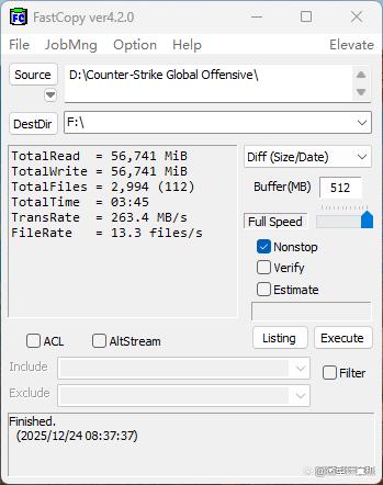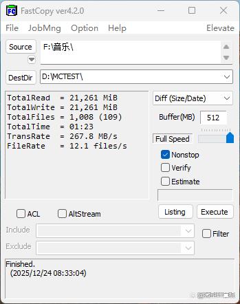 同时我们还进行了传输cs游戏文件夹、内含1008首音乐的文件夹以及内含4000张照片的文件夹的操作。cs游戏文件夹总容量55.41gb,内有2994个文件,从希捷酷狼pro 30tb硬盘的表现来看,其连续读写速度分别为282.4mb/s、263.4mb/s,速度相比传送单个大容量文件时差不多,可见该游戏文件夹内的文件显然还是相对较大的。在传输音乐文件夹和照片文件夹时,希捷酷狼pro 30tb硬盘的读写速度则有些下降,传输音乐文件夹的表现更好一些,267.8mb/s和247.4mb/s的读写速度还是比较理想的。传输照片文件夹的读写速度分别为231.1mb/s和192.2mb/s,写入速度降得更多一些,大量小文件对于传输速度的影响还是相对明显的。