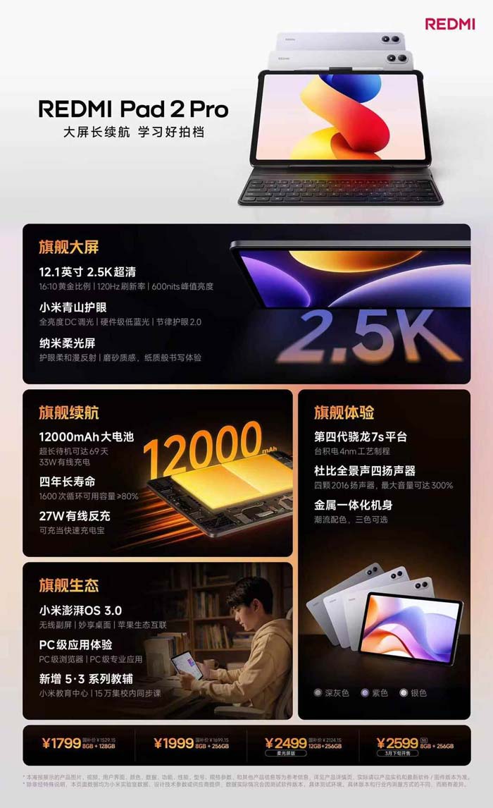 12.1英寸2.5K护眼屏! 小米Redmi Pad 2 Pro平板发布:售价1799元起