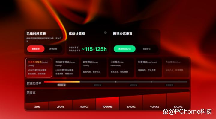 性能模式有五种可以选:狂暴竞技模式、竞技超核模式、超核模式、火力模式、办公模式。打游戏选狂暴竞技模式,传感器扫描频率直接拉满,延迟超低,办公就选办公模式,续航更久,能在性能和续航之间自由切换。最方便的是它能预设不同场景的配置,打开游戏自动切高性能模式,日常用自动切省电模式,不用手动调,特别省心。目前a hub已同时兼容windows、macos双系统及网页驱动三平台,再加上配置文件跟随应用切换功能,在国产厂商中可以说是独一份的存在。