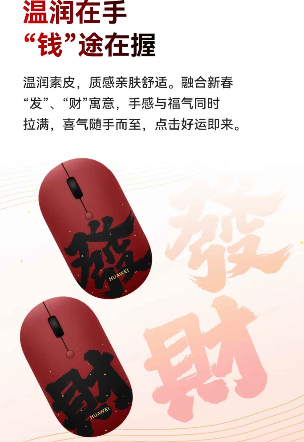 华为无线鼠标 slim 素皮版现已在京东上架,该产品采用红色素皮外观,提供“发”“财”两字版本,定价均为 169 元,明天开售。