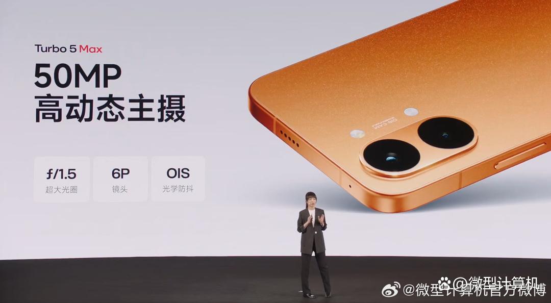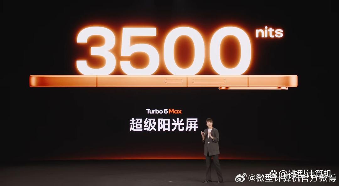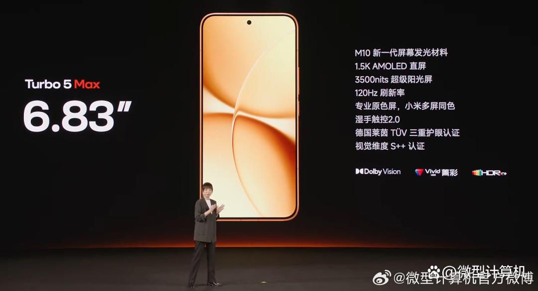 turbo 5 max 采用6.83" 1.5k 分辨率柔性直屏,搭载最新 m10 发光材料,全新红色发光材料,发光效率提升 11.4%,达到全球领先的 82.1cd/a,带来 3500nits 峰值亮度(apl25%),户外强光下也能看得见、看得清。