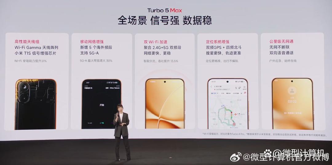 其它方面,turbo 5 max 支持 ip66 & ip68 & ip69 & ip69k 满级防水,并支持湿手触控 2.0。搭载旗舰 gamma 天线阵、小米澎湃 t1s 信号增强芯片并新增独立 2.4ghz fem,穿墙能力较上代提升 31.2%,进一步提升弱网场景的网络体验。升级双频 gps、四频北斗,可实现更精准的定位导航。同时还支持公里级无网通功能,可在无网络环境下实现双向语音通话。