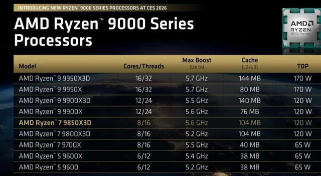 从产品的命名上,可以看出锐龙7 9850x3d并不是x3d系列处理器的一次大幅更新。它仍采用amd zen 5处理器架构、tsmc 4nm工艺,以及第二代3d堆叠缓存技术,即3d缓存从处理器顶部“搬迁”到处理器ccd下方,和整个锐龙9000x3d系列产品同属一个时代的产品。不过在游戏性能上,它有可能是整个9000x3d系列阵营中最有竞争力的一款产品。技术规格方面,与锐龙7 9800x3d相比,它虽然仍采用8核心、16线程设计,但最高加速频率高了400mhz。