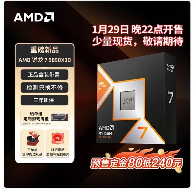 ▲amd为锐龙7 9850x3d带来了预售定金80抵240元的活动,相当于降价160元。