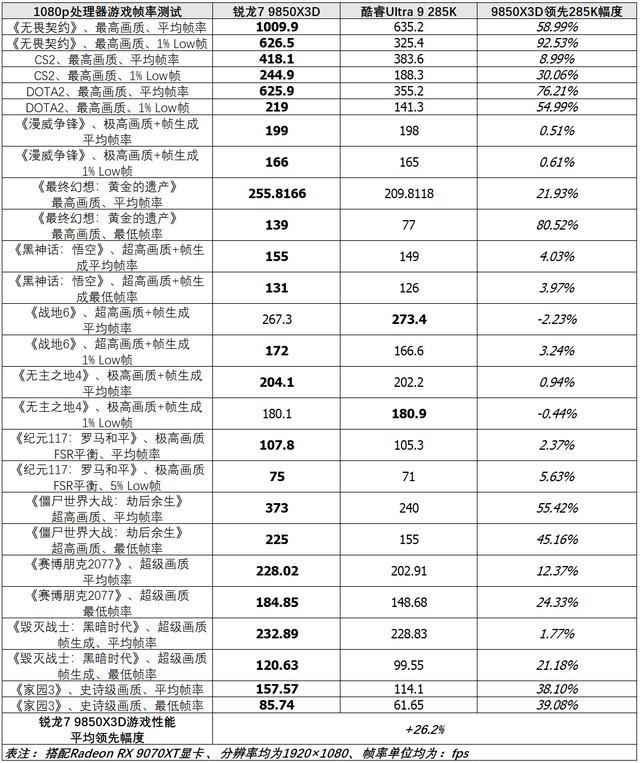 由于在26个项目中,锐龙7 9850x3d领先了24个,其中一些项目的领先幅度特别大,最终锐龙7 9850x3d在1920×1080分辨率下的游戏性能平均领先酷睿ultra 9 285k达26.2%。整个1080p游戏测试中,酷睿ultra 9 285k仅在《无主之地4》《战地6》中与锐龙7 9850x3d平分秋色。其中在《无主之地4》中锐龙7 9850x3d的平均帧率略快,而酷睿ultra 9 285k的1% low帧高了0.8fps;在《战地6》中,锐龙7 9850x3d的平均帧率落后酷睿ultra 9 285k为2.23%,但它的1% low帧却反过来领先3.24%。